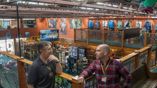 There was, front and center, a campfire scene with a circle of chairs around a mock fire pit with an illuminated flickering bandanna of fabric at the center. An outer radius of tents equipped with bags and pads, formed a believable backcountry scene inside the cozy shop. Behind that, a central wedge of stairs rose to an upper-level mezzanine that wrapped the store, dividing and organizing the space into a logical framework.