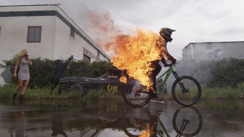 To capture Agassiz’s metamorphosis, Sherpas splices together dreamlike shots of temptation personified with intense free-riding scenes filmed in surreal landscapes in Iceland. In one example, we see Agassiz reclining in steaming hot springs while a trio of naked women feeds him candy, then suddenly we're in the middle of a shaky sequence of the man tearing through black volcanic sand on his bike. A long, slow-motion shot of Agassiz cycling across a wet cement drive, his body on fire, is similarly striking.