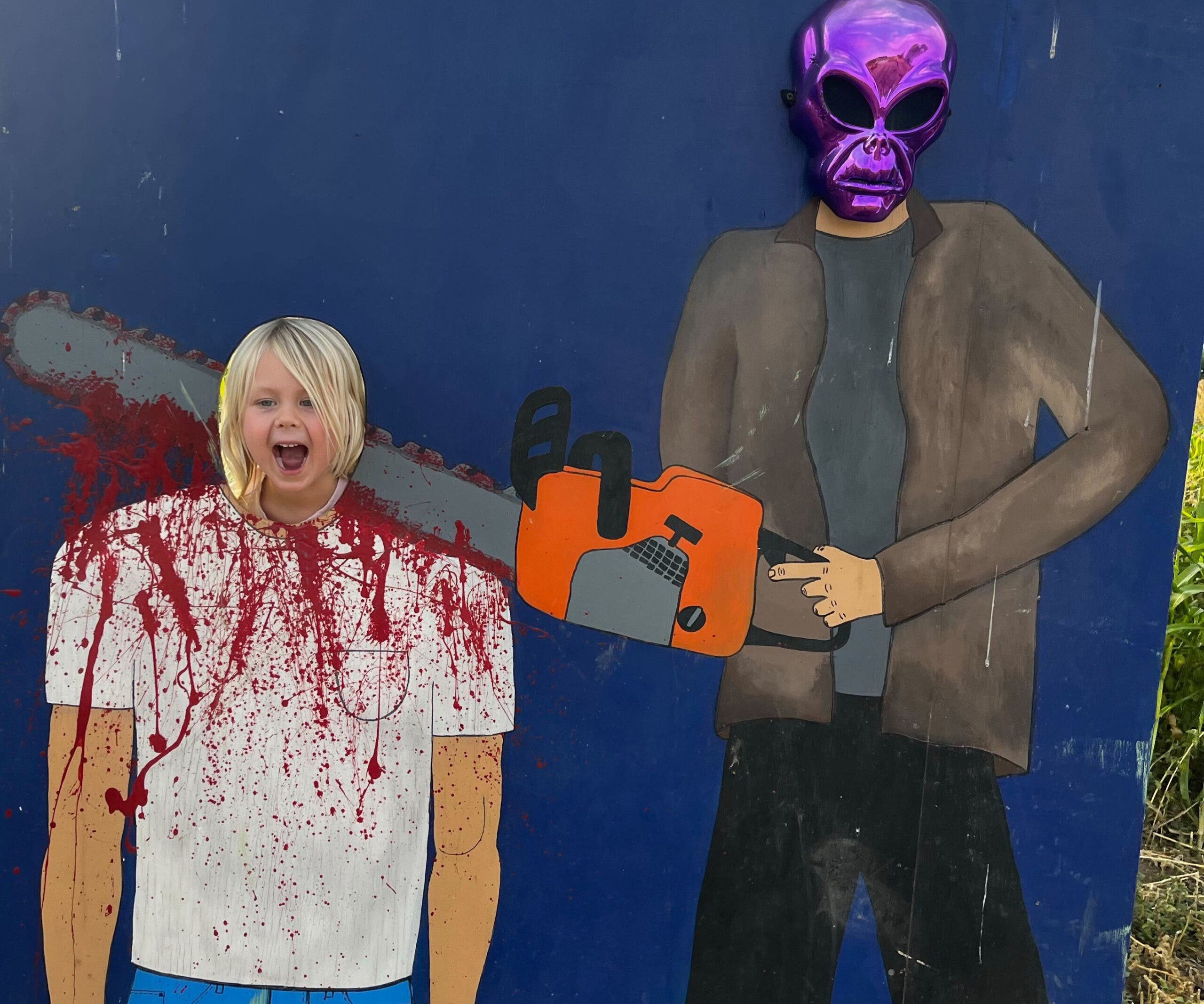 OK, thank god, you found the exit, and not a moment too soon. Kids, go up to those plywood face cutouts and let me get your photo. This one is of a dog and cat. This one is a farmer and a cow. Ooh, this one is of a homicidal purple alien chainsawing my child’s head off. I think we found our 2025 Christmas Card.