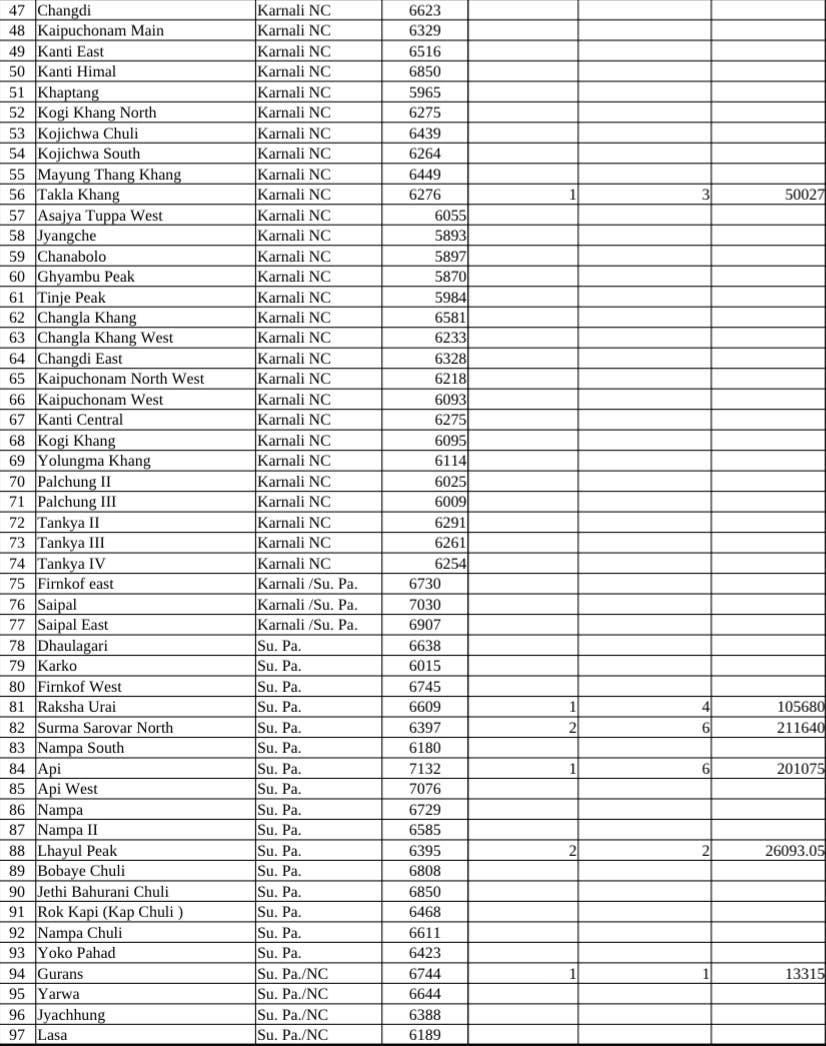 Officials said the move is aimed at promoting tourism in far-flung areas of the country. Seventy-seven of these peaks are located in Nepal鈥檚 Karnali province with the remaining 20 in Sudurpaschim. The two provinces are located on the western edge of the country, along its border with India. Of the 77 peaks that no longer require government royalties, the highest surpass 24,000 feet elevation.