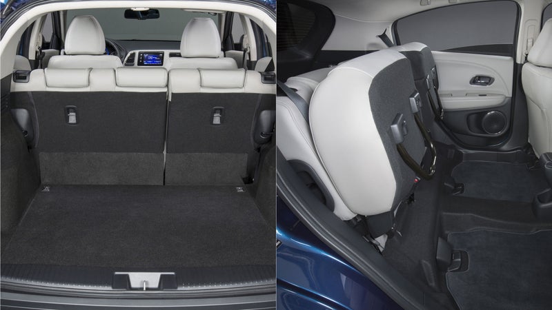 Both rear seats flip upward, like the spring-loaded seats at a ballpark, revealing a nearly completely flat load area. In the HR-V, we loaded one upright 70-liter backpack into this space, behind the driver, and two more packs into the hatch, leaving room for three passengers.聽